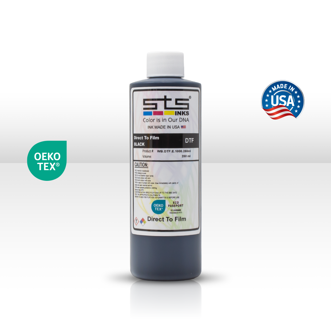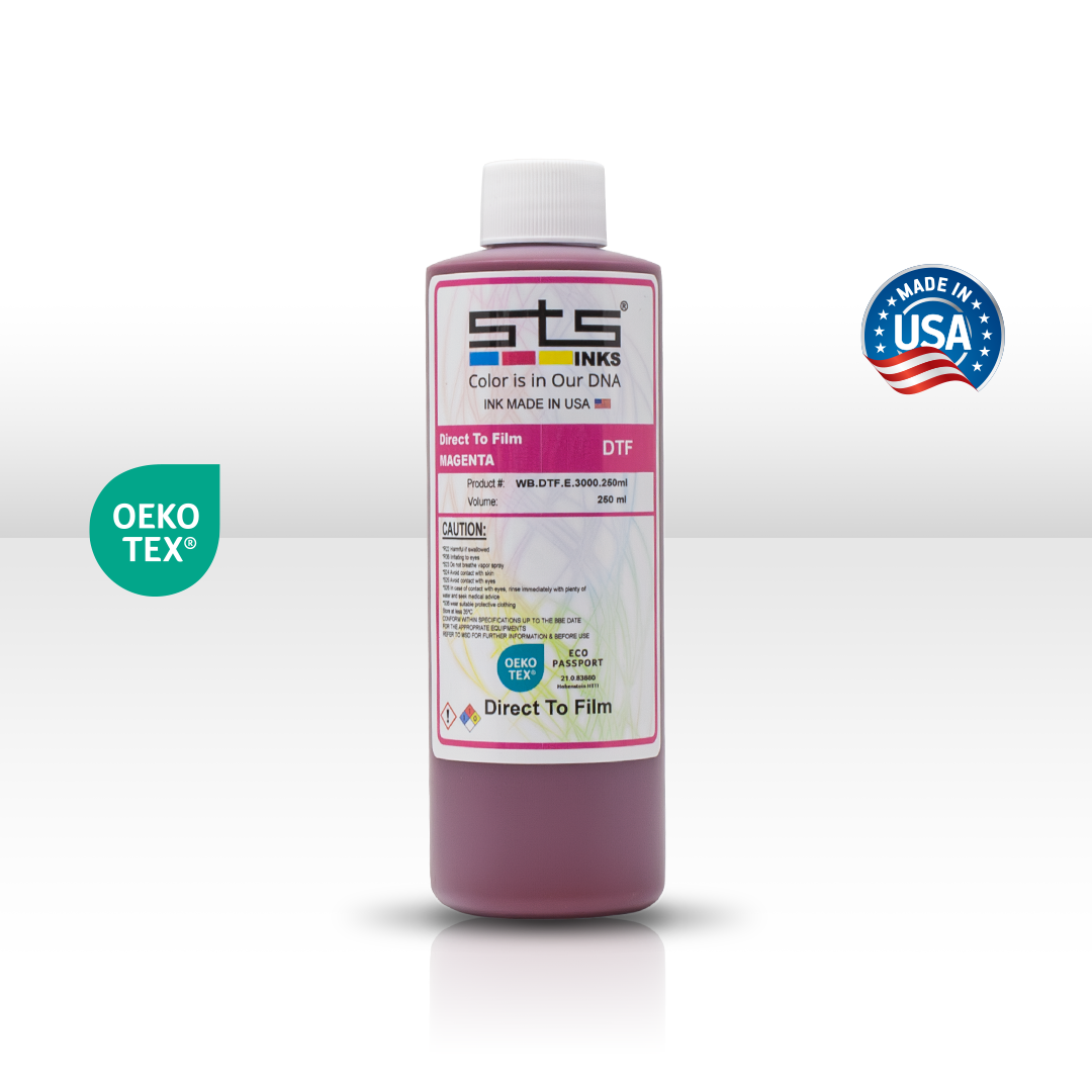 Manufactured in the USA with Safety and Consistency in Every Batch, STS Inks’ direct-to-film transfer inks are formulated for the Epson printheads and Epson 6-8 color desktop printers. The inks have a 1-year shelf life and carry the STS printhead warranty. Just follow our registration requirements. ICC profiles are also available for your printer.