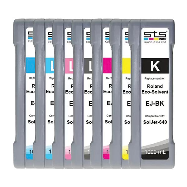 Specifically manufactured to match the exact performance and color properties of the Eco-Solvent EJ ink for Roland’s SolJet EJ-640 (OEM: EJ). This STS Ultra Premium Eco-Solvent ink has a stunning color gamut, performance, accurate color reproduction and the ability to print on a wide range of media. Our colors are a virtual match of the original and since it’s so incredibly close to the original there is no need to change the color profile or flush the ink lines. It has virtually no scent and is Plug & Print just like the original EJ Ink. Environmentaly friendly, water resistant, outdoor durability without lamination: similar to OEM.